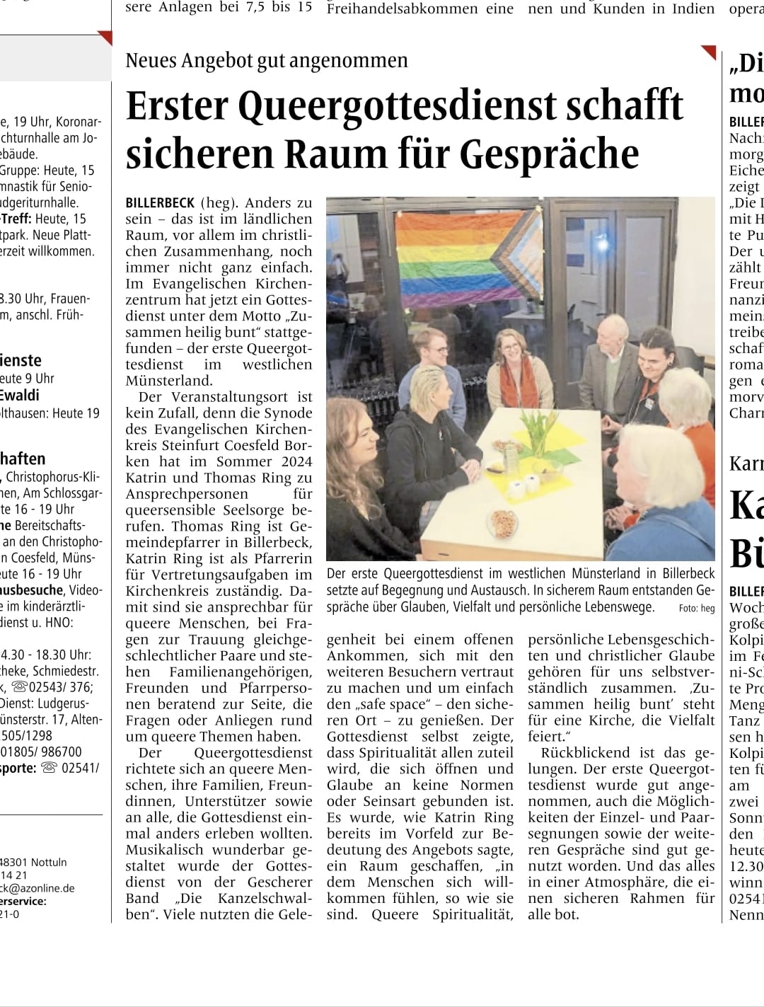 Ein bißchen wie die Jungfrau zum Kind kamen wir dazu, die Musik im ersten Queergottesdienst im Westmünsterland zu spielen. Aber passende Stücke gibt es ja durchaus in unserem Repertoire… Es war es sehr wohltuender und bewegender Gottesdienst und offenbar hatten auch wir unseren Anteil daran. Die Presse schrieb jedenfals: "Musikalisch wunderbar gestaltet wurde der Gottesdienst von der Gescherer Band Die Kanzelschwalben."